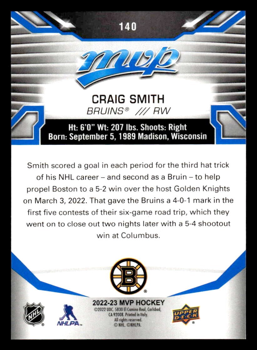 This is a nice example of a 2022-23 Upper Deck MVP #140 Craig Smith Blue Script