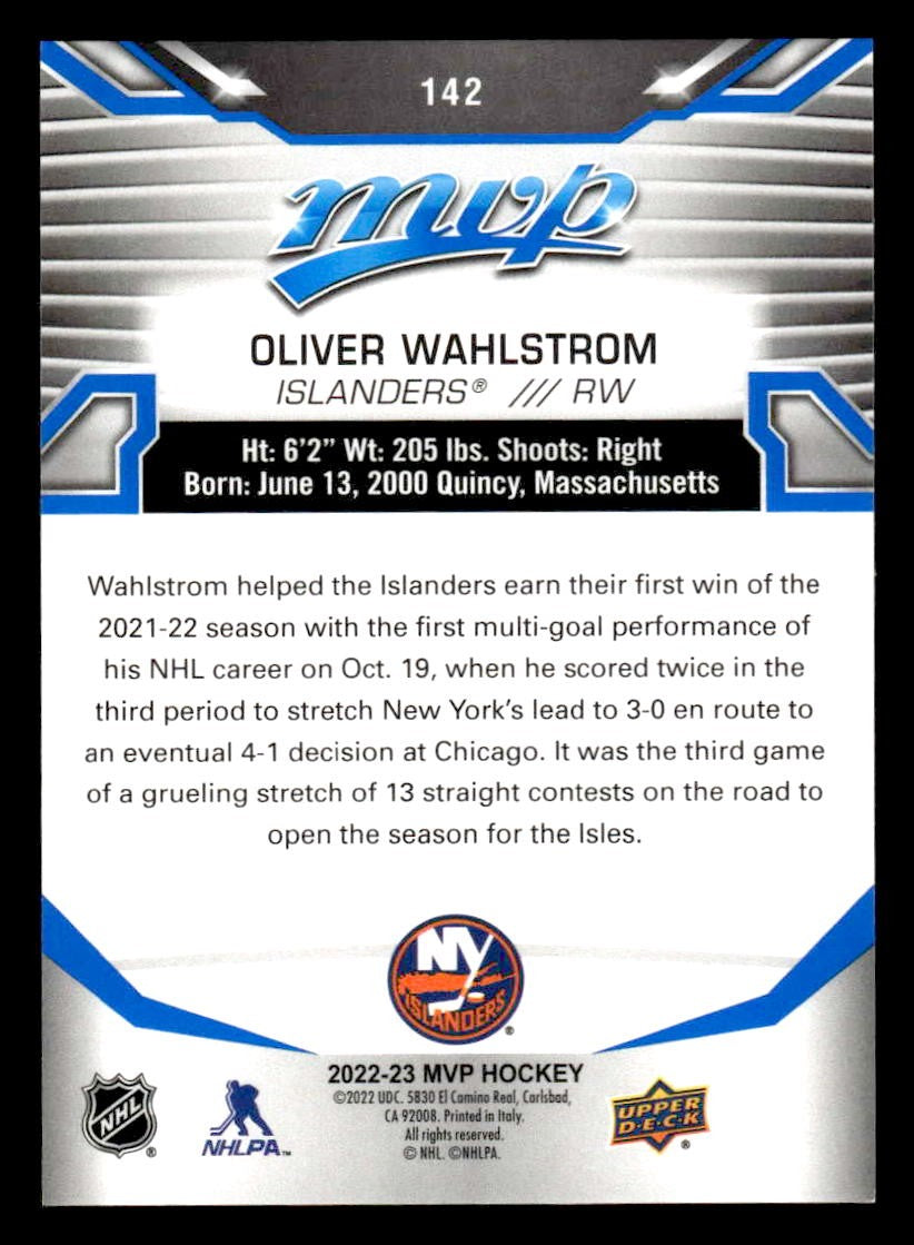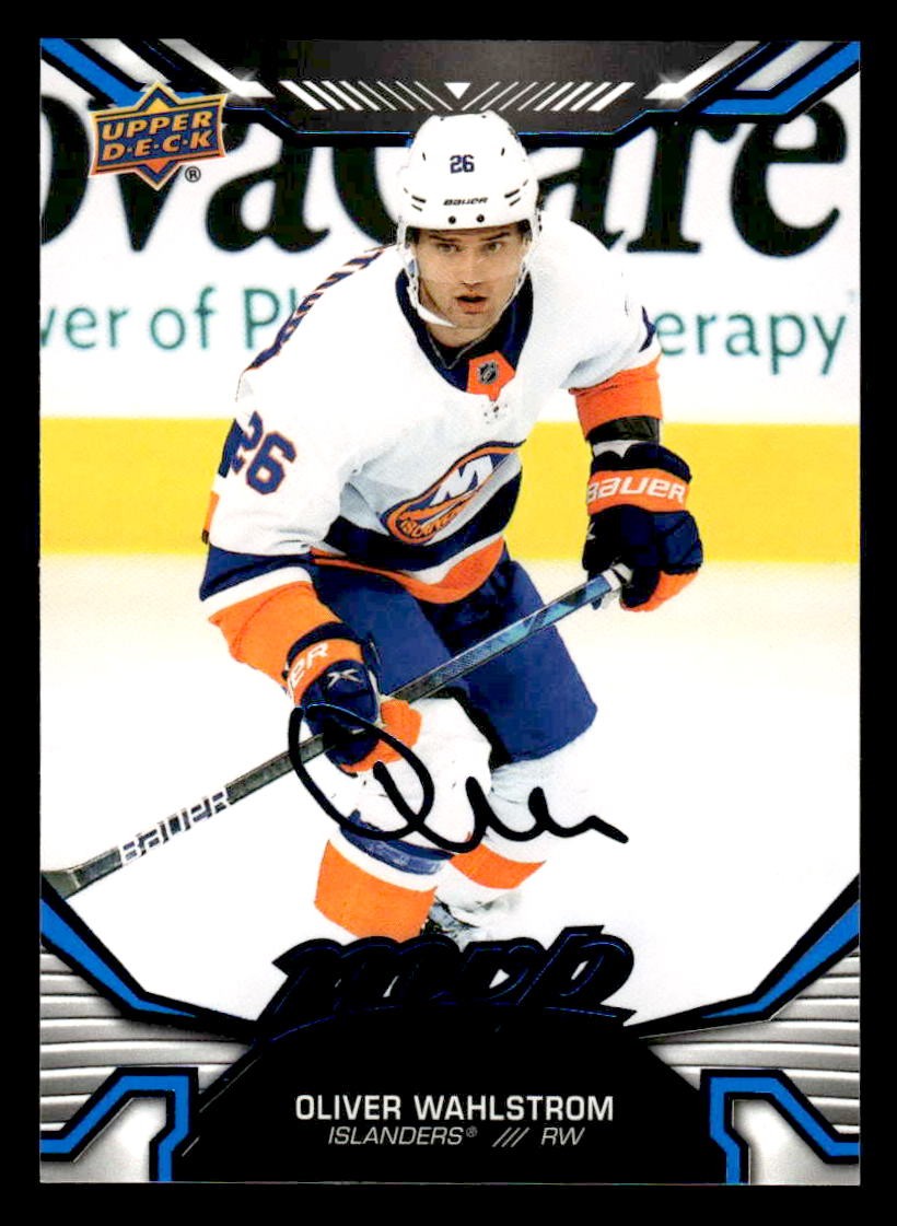 This is a nice example of a 2022-23 Upper Deck MVP #142 Oliver Wahlstrom Blue Script