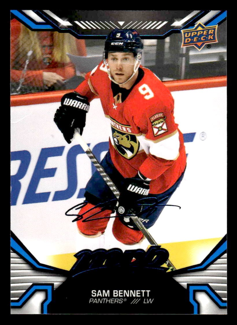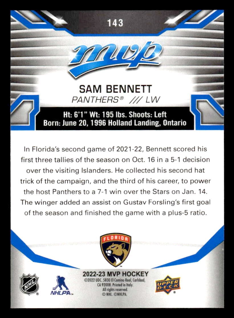 This is a nice example of a 2022-23 Upper Deck MVP #143 Sam Bennett Blue Script