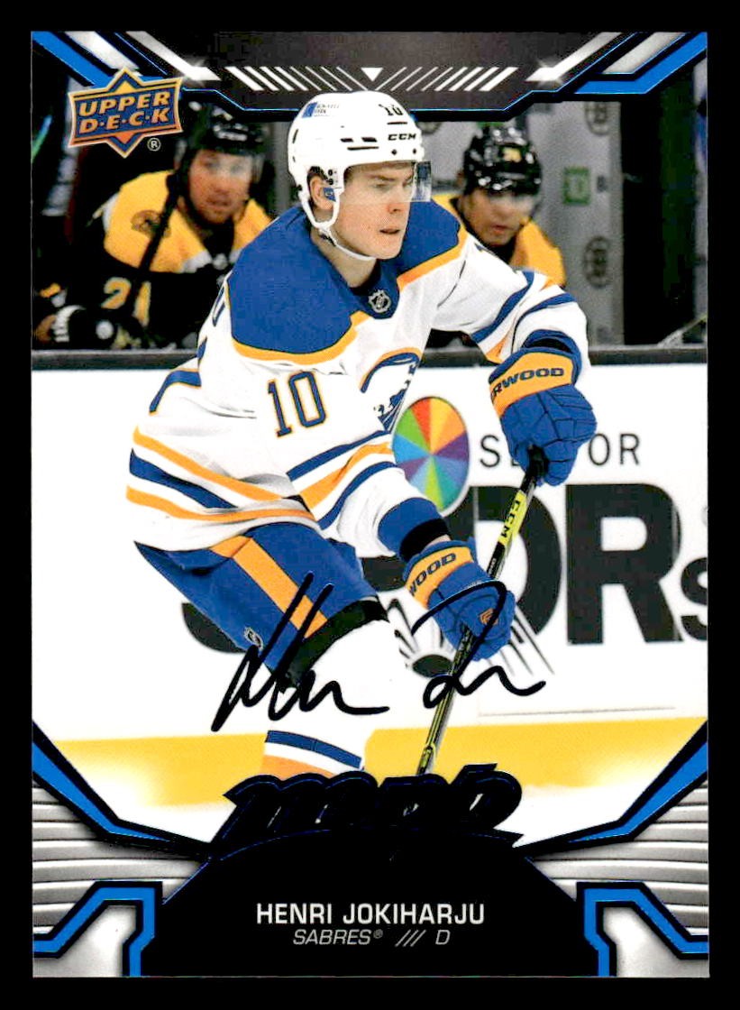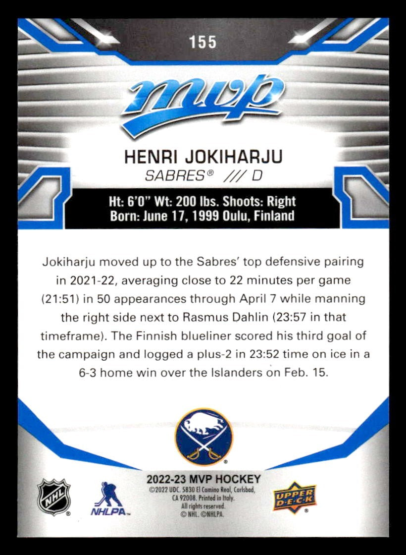 This is a nice example of a 2022-23 Upper Deck MVP #155 Henri Jokiharju Blue Script