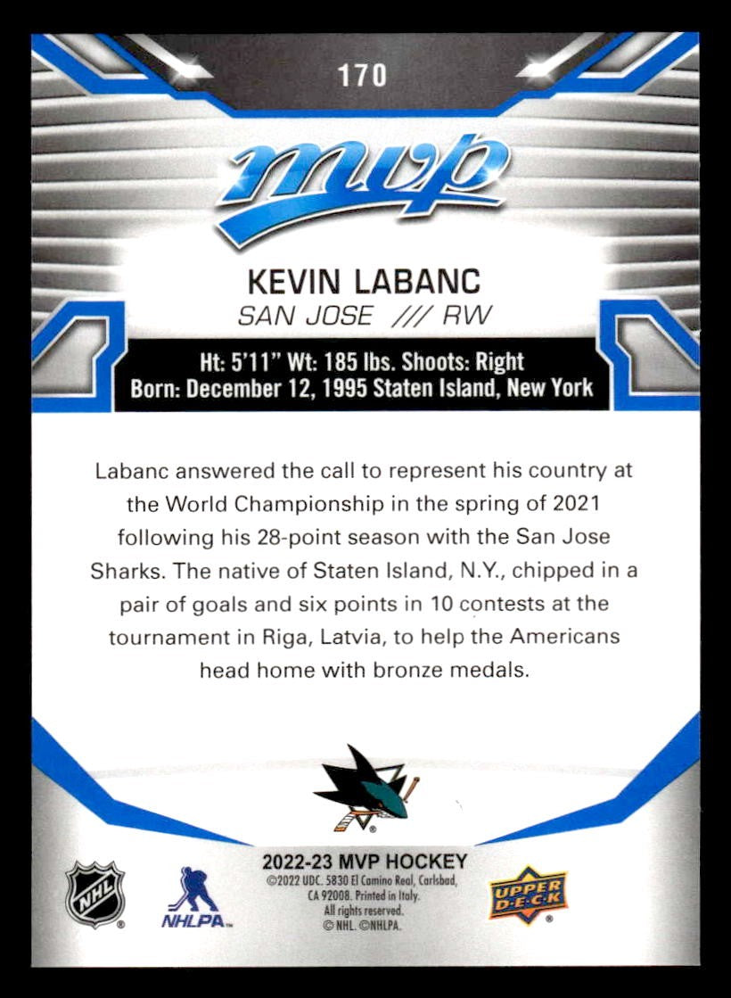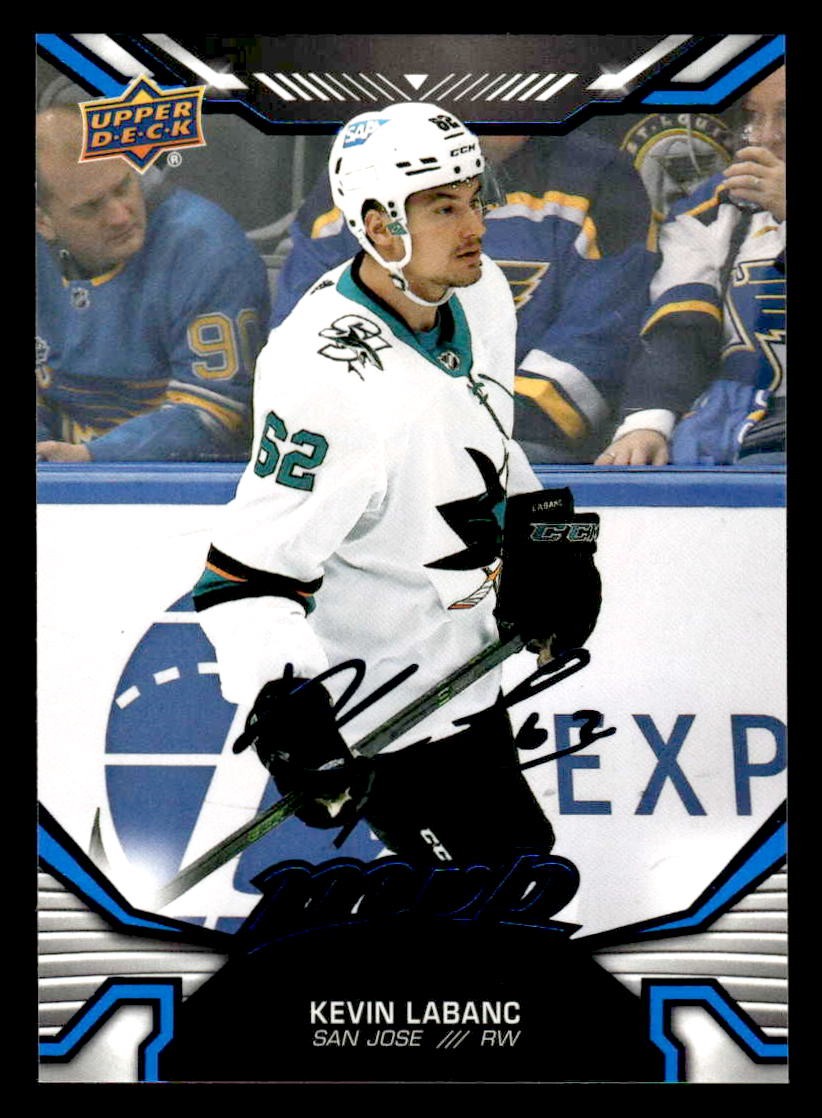 This is a nice example of a 2022-23 Upper Deck MVP #170 Kevin Labanc Blue Script