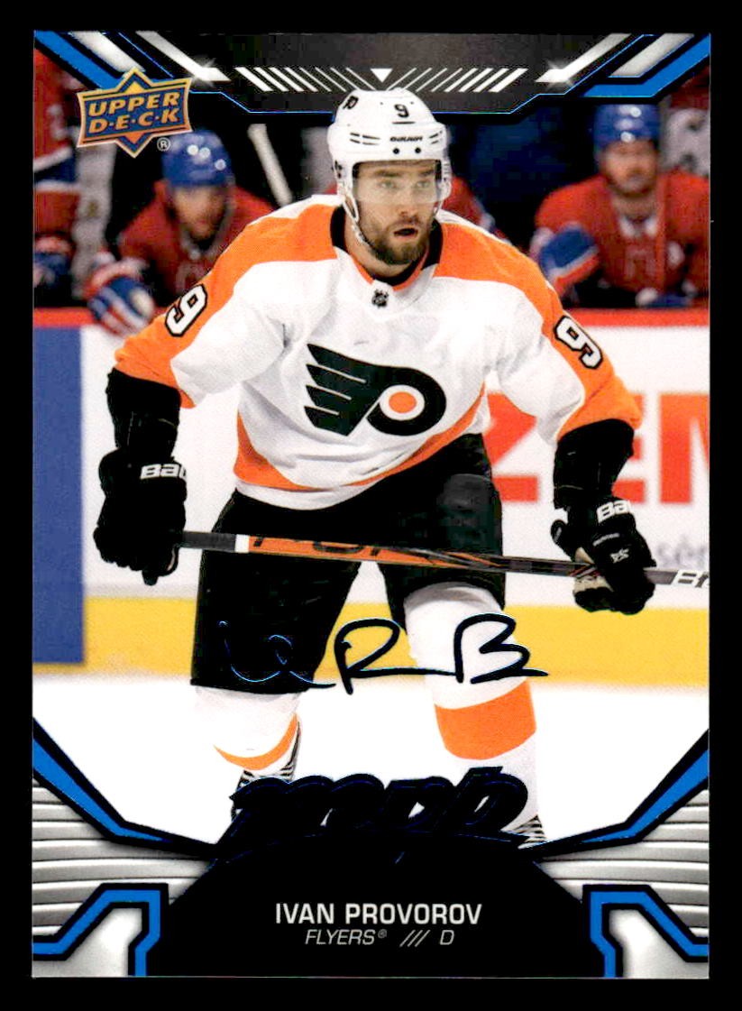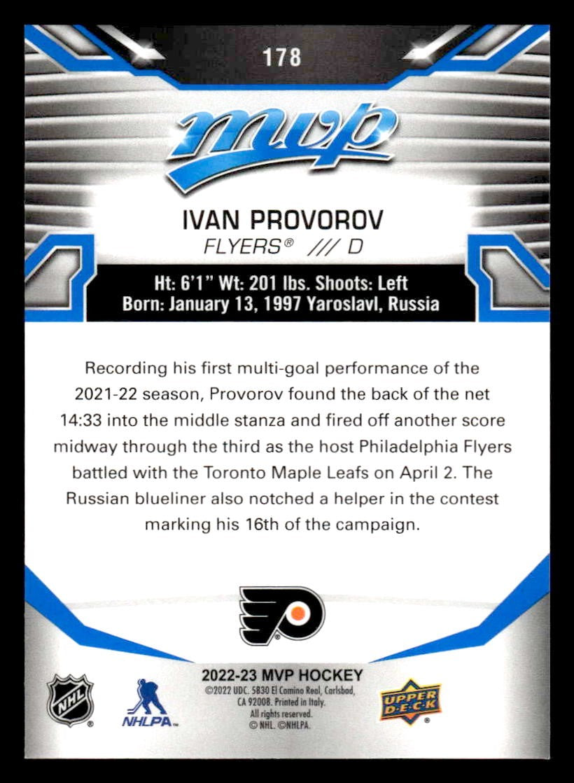 This is a nice example of a 2022-23 Upper Deck MVP #178 Ivan Provorov Blue Script