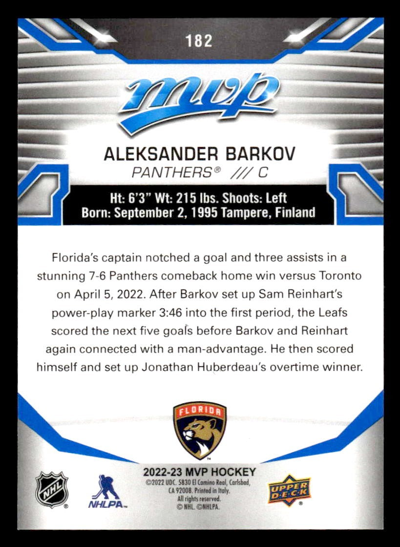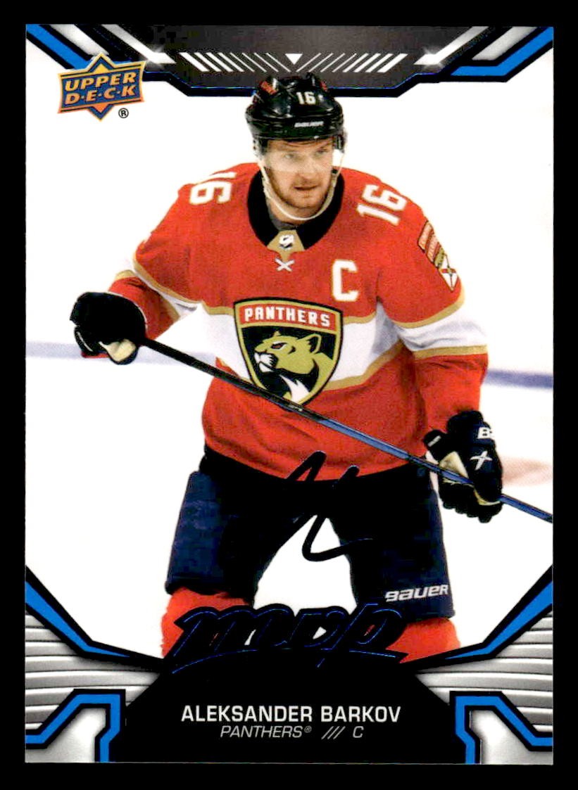 This is a nice example of a 2022-23 Upper Deck MVP #182 Aleksander Barkov Blue Script