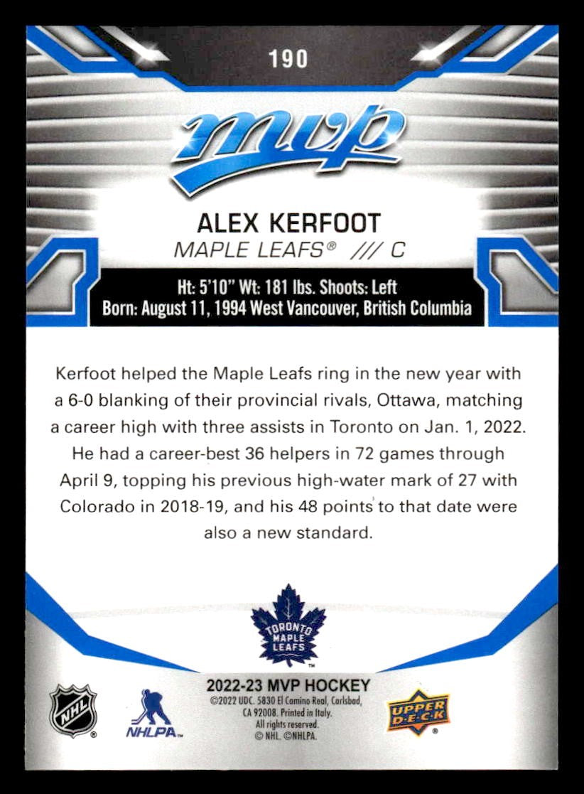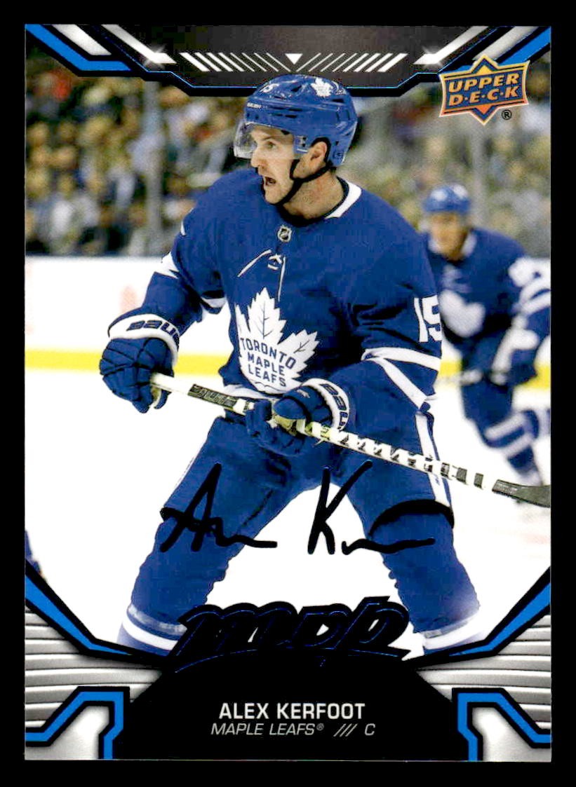 This is a nice example of a 2022-23 Upper Deck MVP #190 Alex Kerfoot Blue Script
