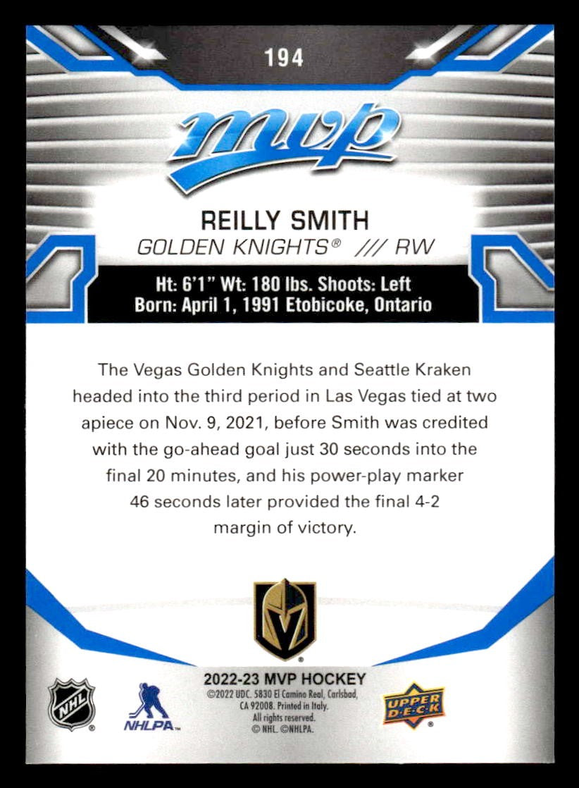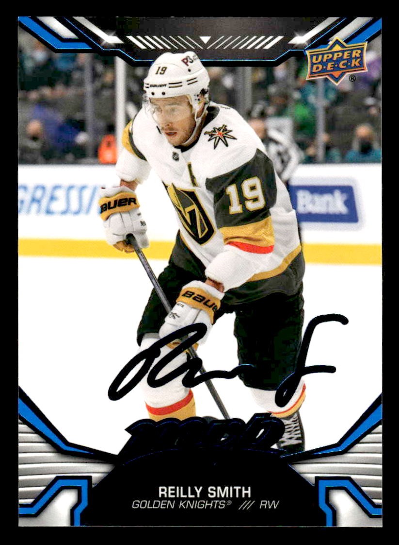This is a nice example of a 2022-23 Upper Deck MVP #194 Reilly Smith Blue Script