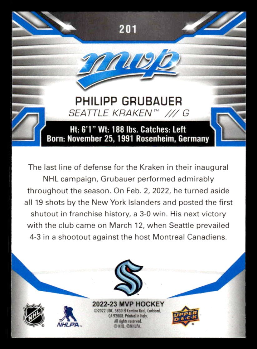 This is a nice example of a 2022-23 Upper Deck MVP #201 Philipp Grubauer Blue Script