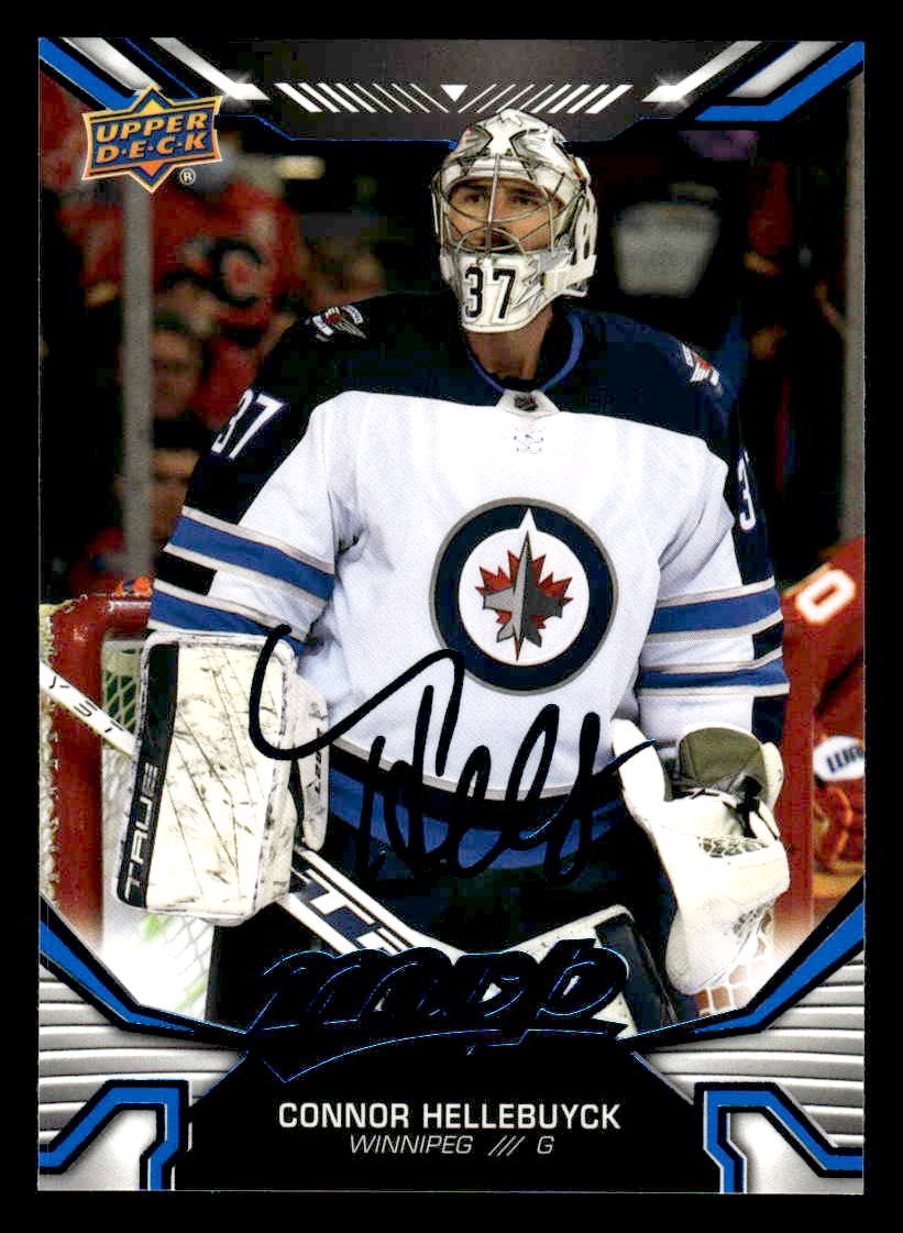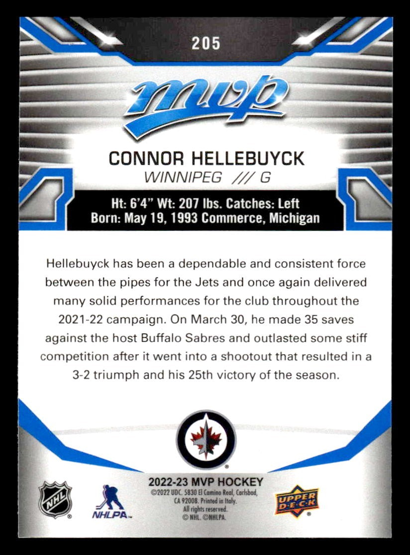 This is a nice example of a 2022-23 Upper Deck MVP #205 Connor Hellebuyck Blue Script