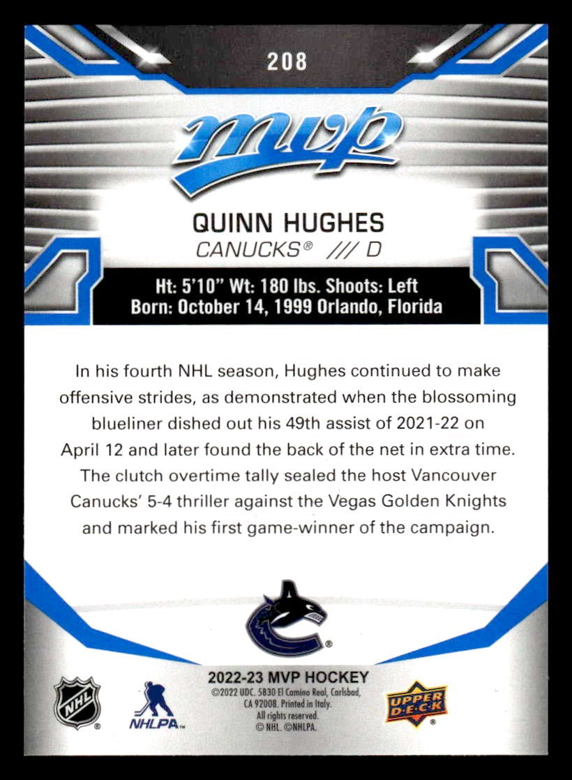 2022-23 Upper Deck MVP #208 Quinn Hughes Blue Script