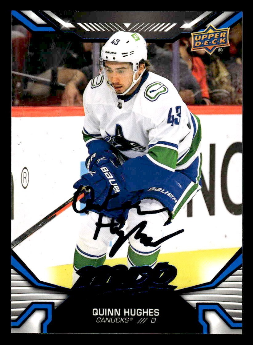 This is a nice example of a 2022-23 Upper Deck MVP #208 Quinn Hughes Blue Script