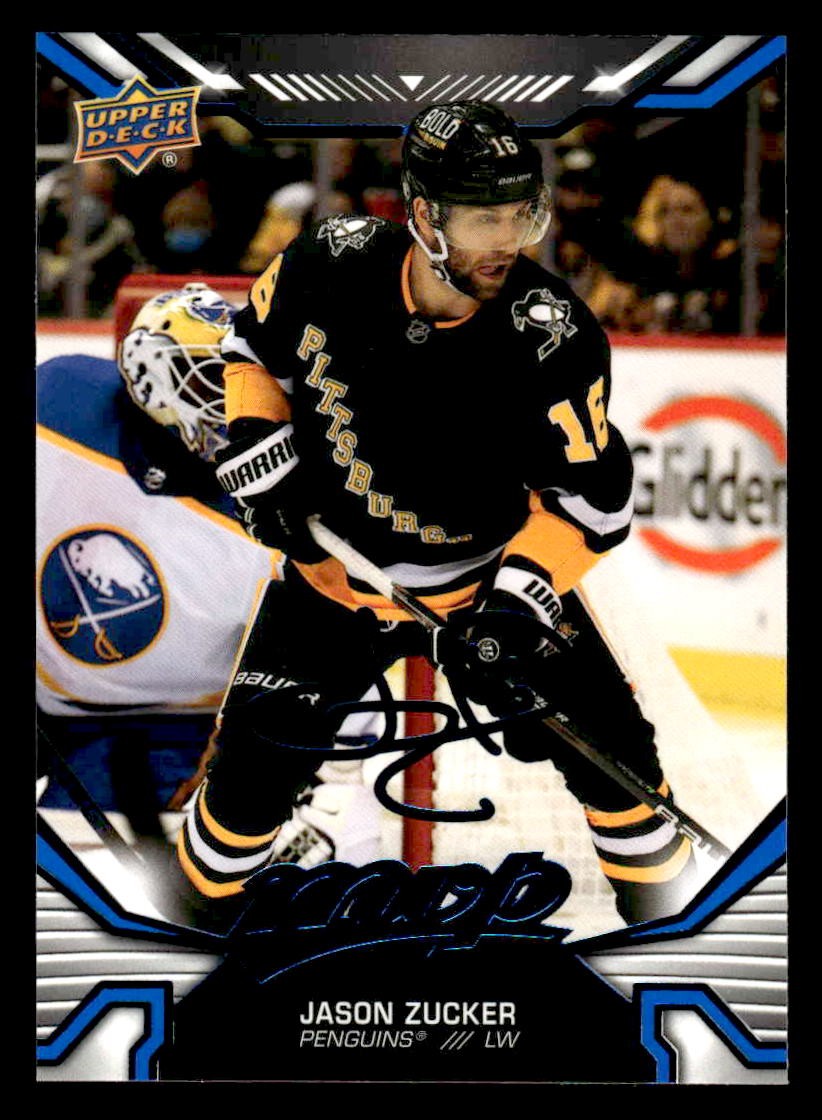 This is a nice example of a 2022-23 Upper Deck MVP #210 Jason Zucker Blue Script