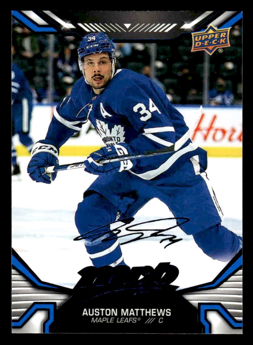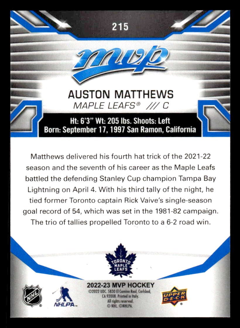 This is a nice example of a 2022-23 Upper Deck MVP #215 Auston Matthews Blue Script