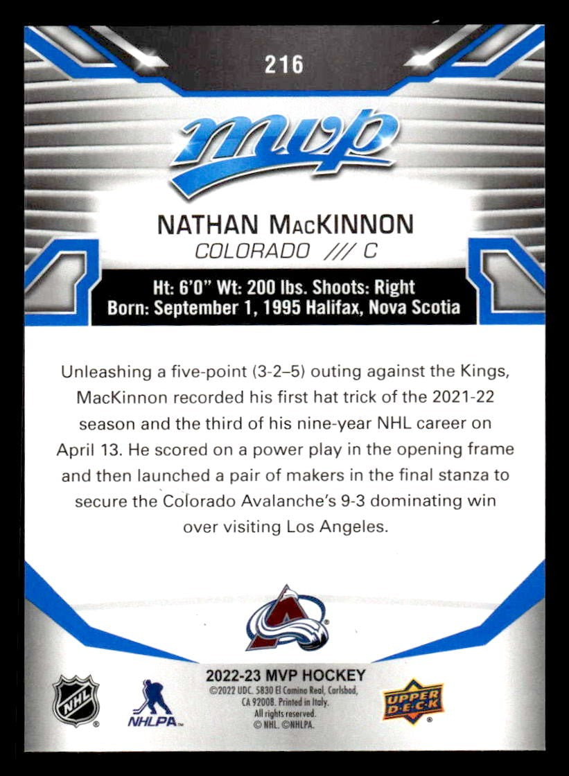 This is a nice example of a 2022-23 Upper Deck MVP #216 Nathan MacKinnon Blue Script
