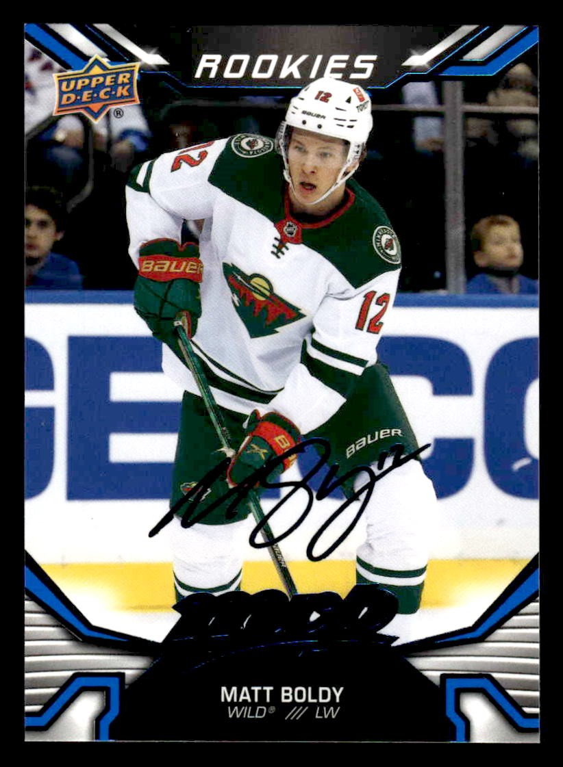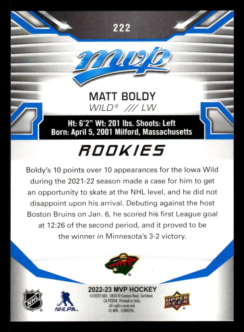 This is a nice example of a 2022-23 Upper Deck MVP #222 Matt Boldy Blue Script