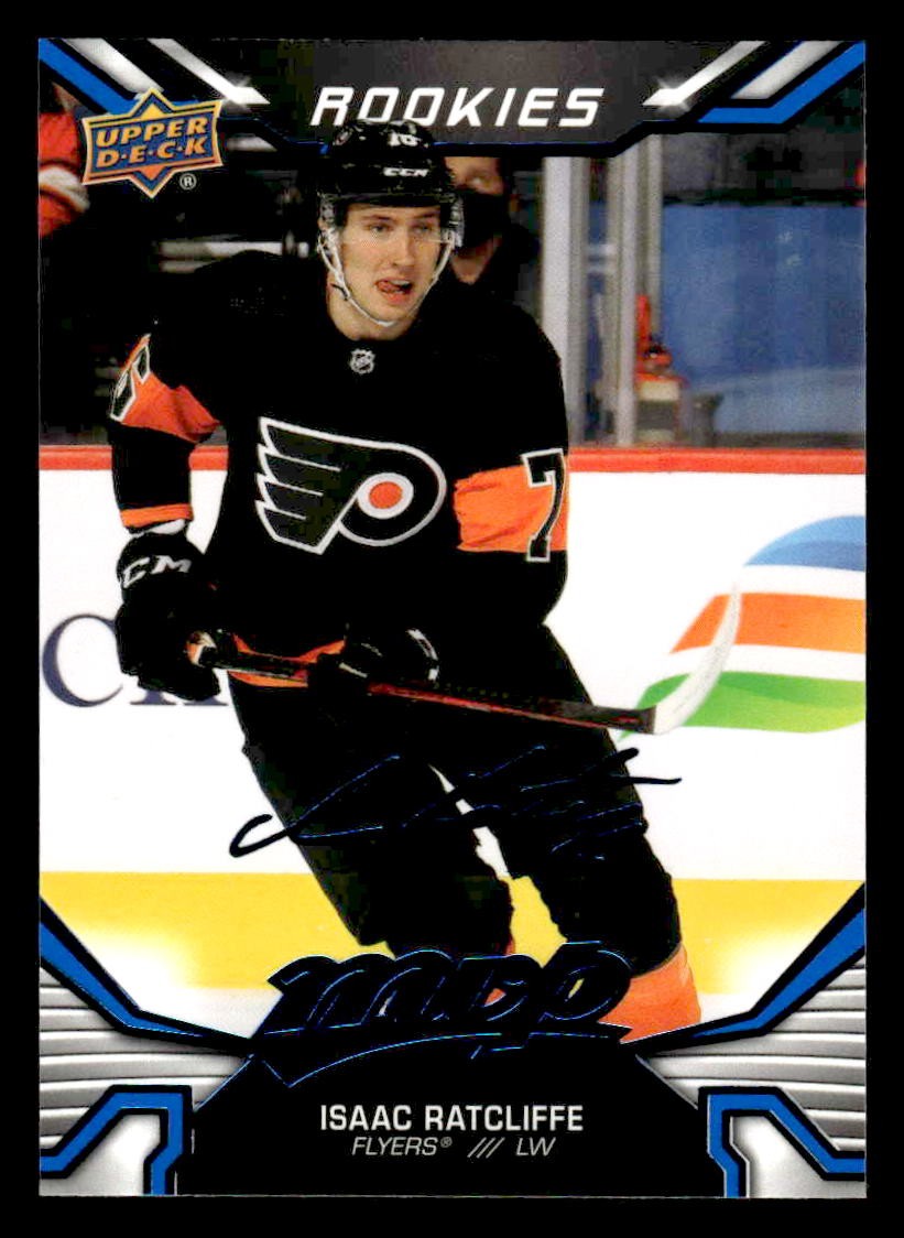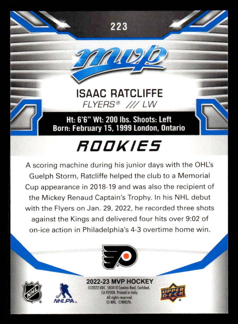 This is a nice example of a 2022-23 Upper Deck MVP #223 Isaac Ratcliffe Blue Script