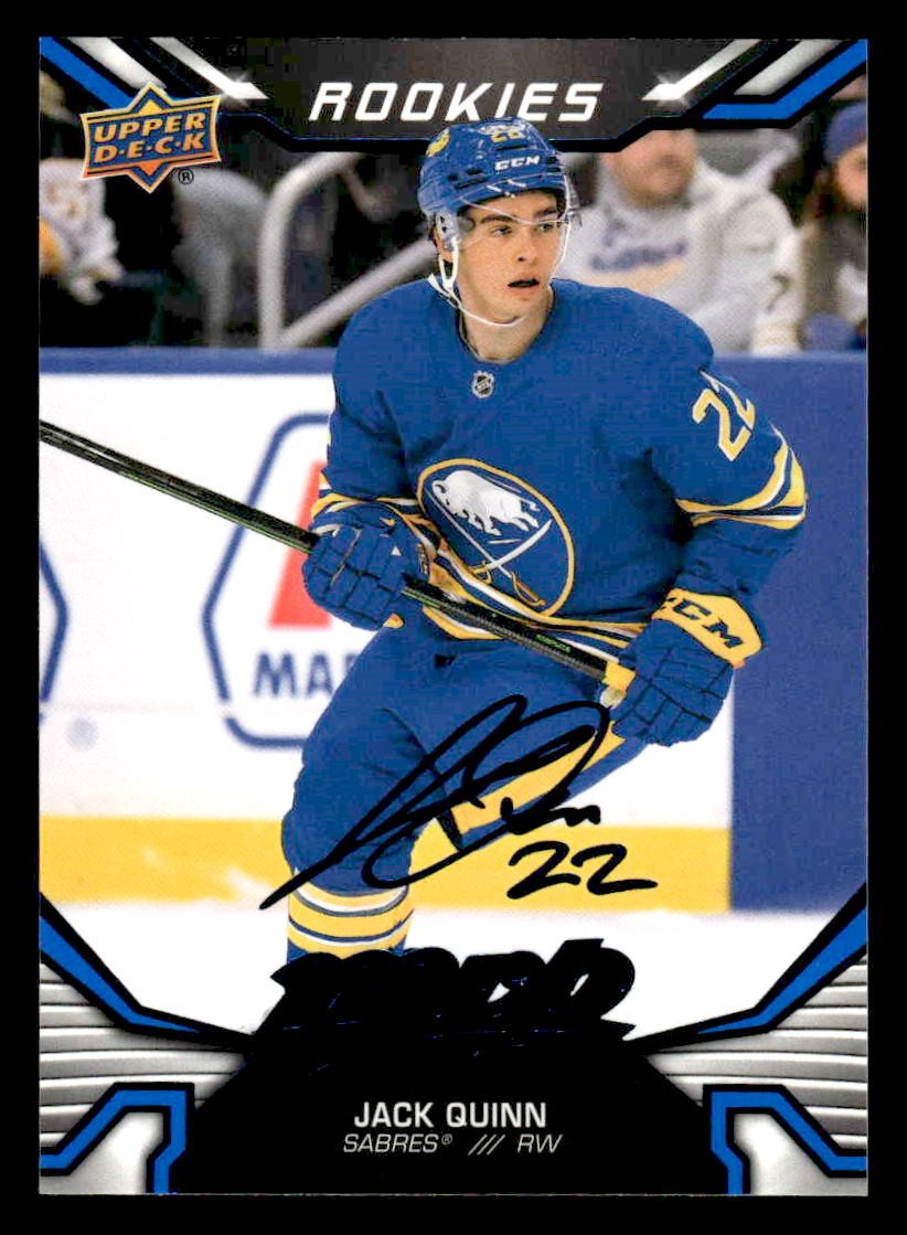 This is a nice example of a 2022-23 Upper Deck MVP #228 Jack Quinn Blue Script