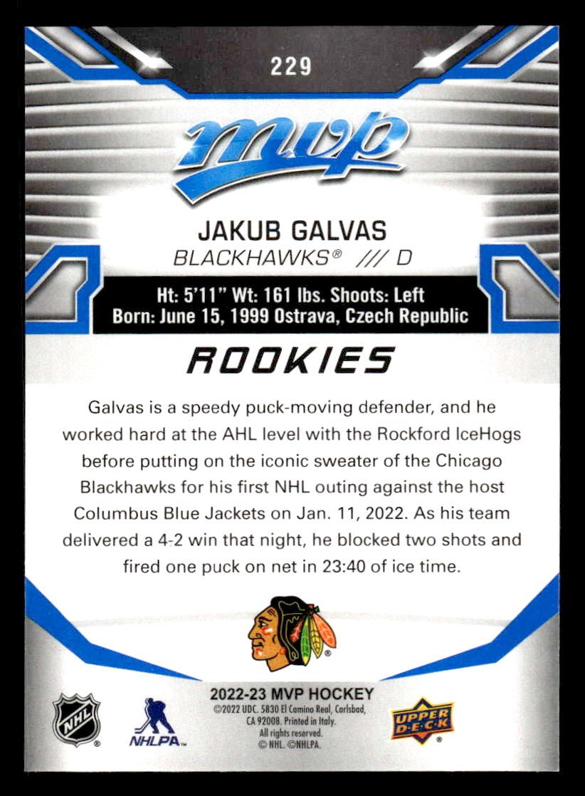 This is a nice example of a 2022-23 Upper Deck MVP #229 Jakub Galvas Blue Script
