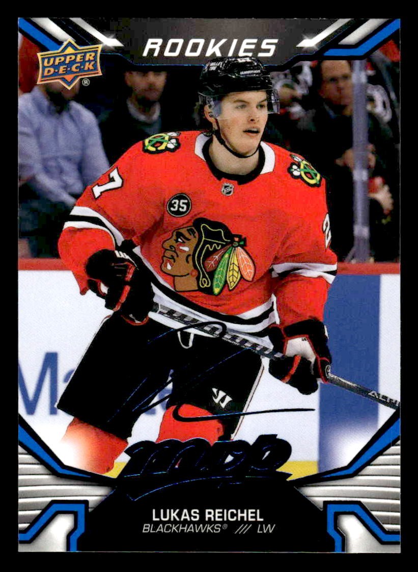 This is a nice example of a 2022-23 Upper Deck MVP #234 Lukas Reichel Blue Script