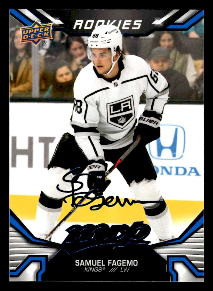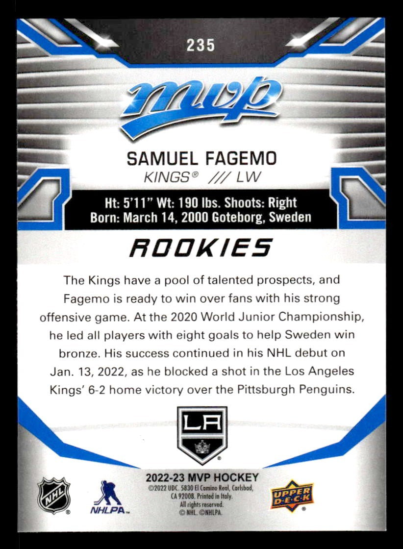 This is a nice example of a 2022-23 Upper Deck MVP #235 Samuel Fagemo Blue Script