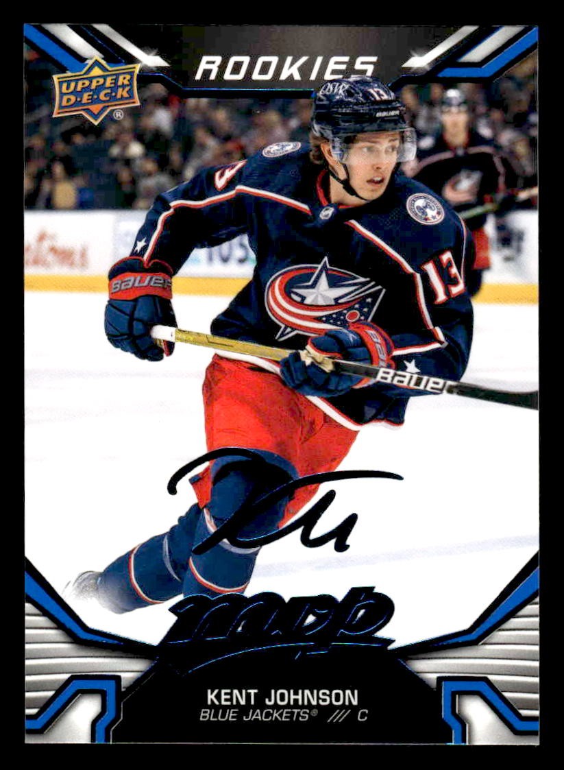 This is a nice example of a 2022-23 Upper Deck MVP #242 Kent Johnson Blue Script