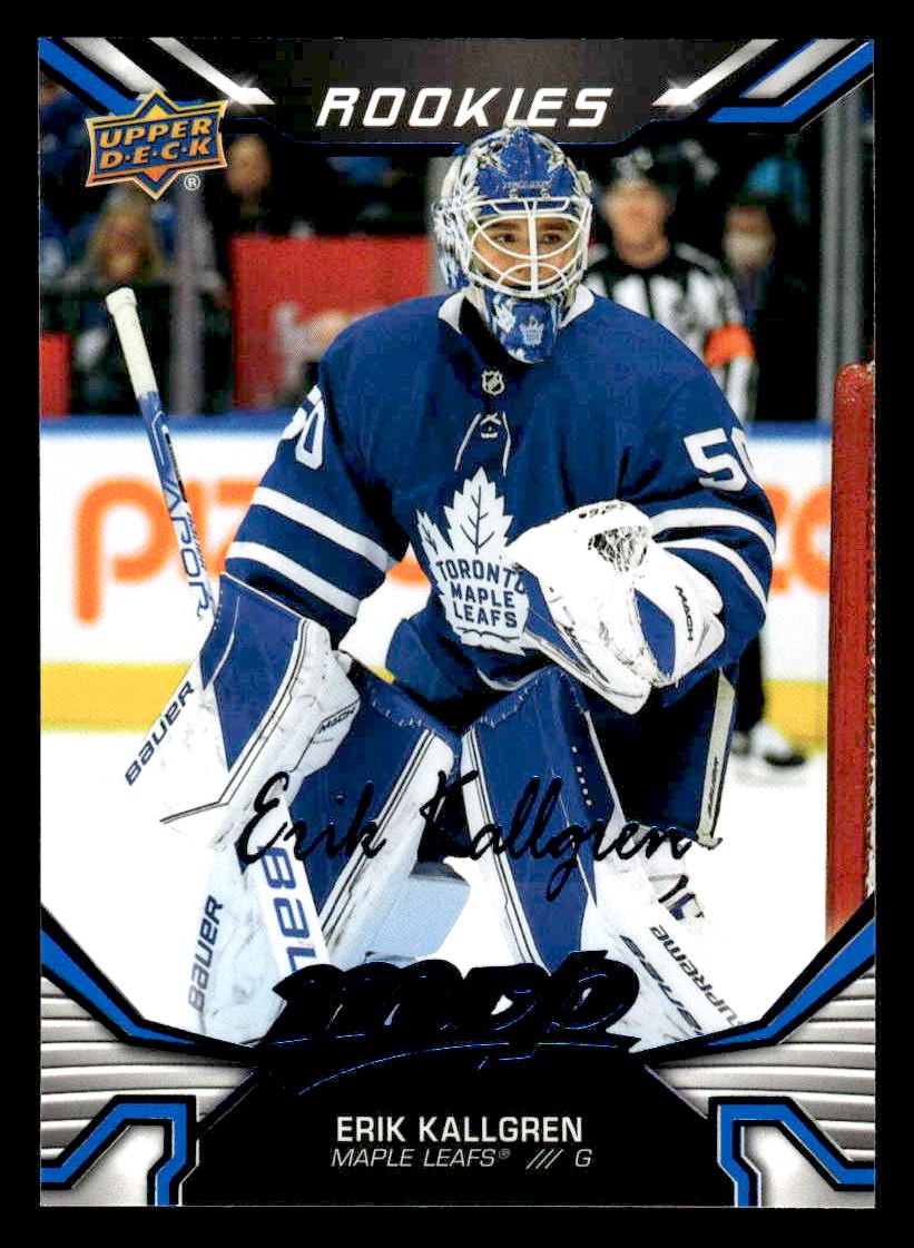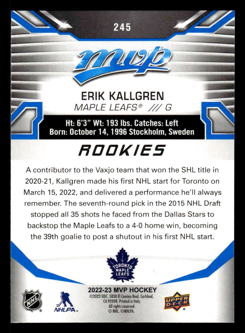 This is a nice example of a 2022-23 Upper Deck MVP #245 Erik Kallgren Blue Script