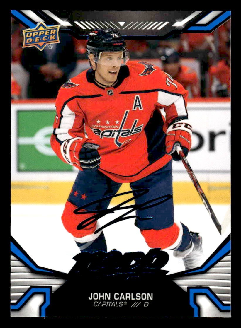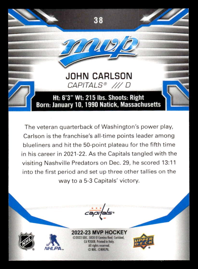 This is a nice example of a 2022-23 Upper Deck MVP #38 John Carlson Blue Script