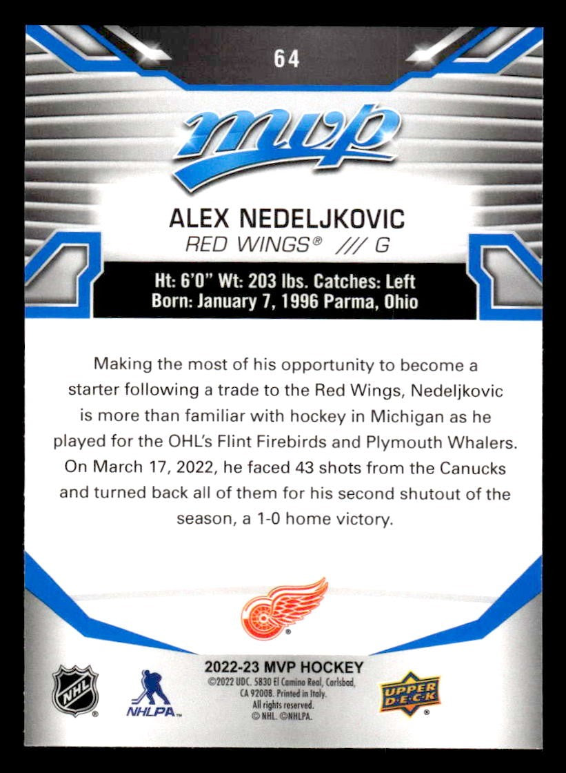 This is a nice example of a 2022-23 Upper Deck MVP #64 Alex Nedeljkovic Blue Script