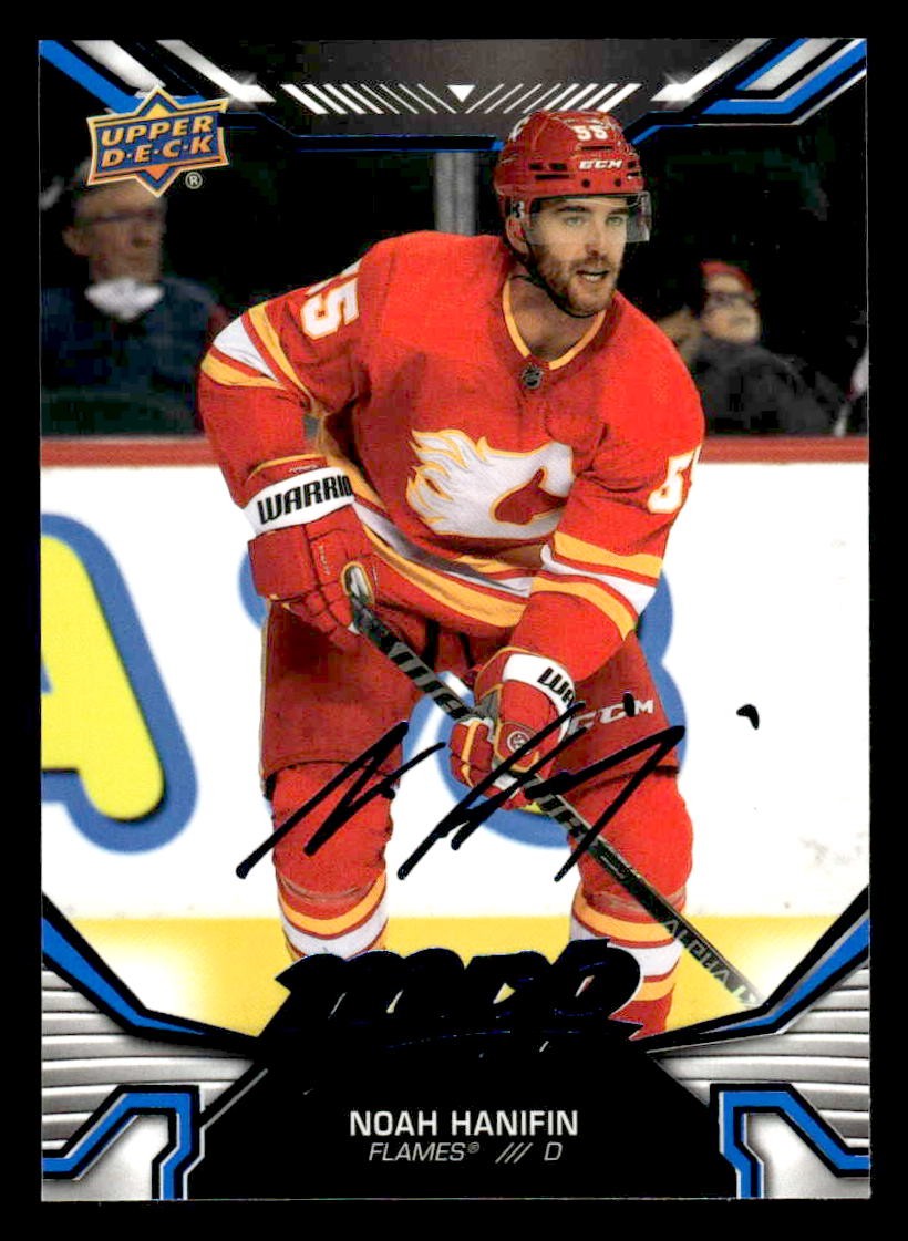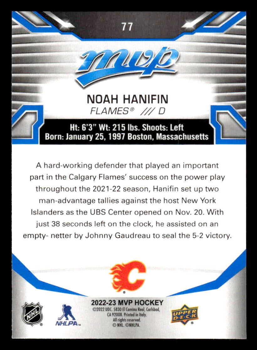 This is a nice example of a 2022-23 Upper Deck MVP #77 Noah Hanifin Blue Script