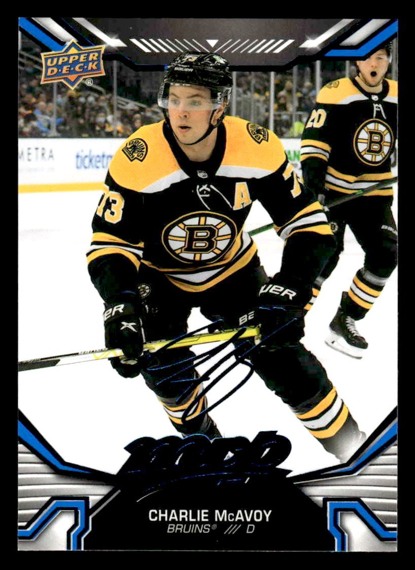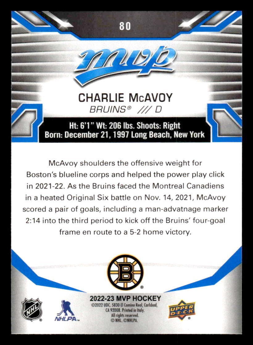 This is a nice example of a 2022-23 Upper Deck MVP #80 Charlie McAvoy Blue Script