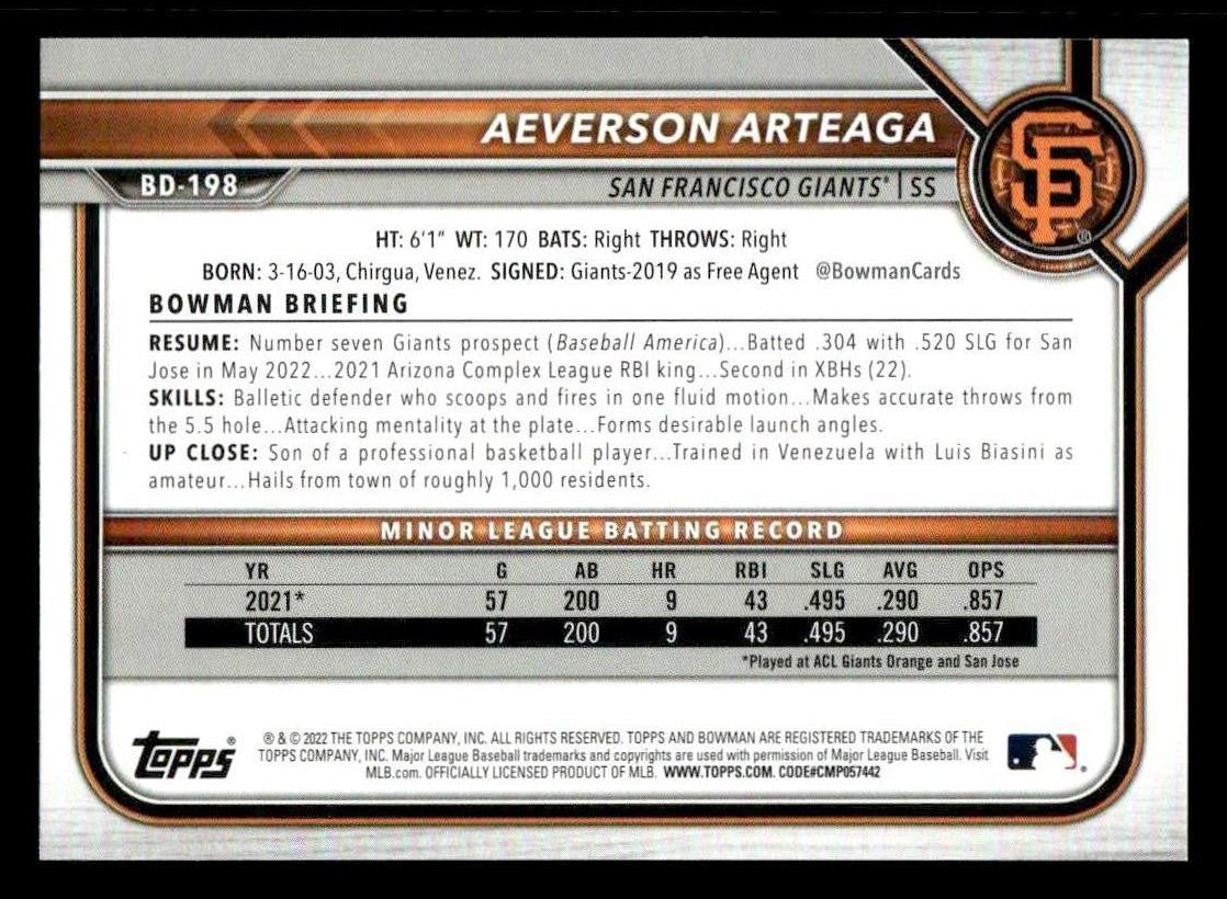 2022 Bowman Draft 1st Edition #BD-198 Aeverson Arteaga