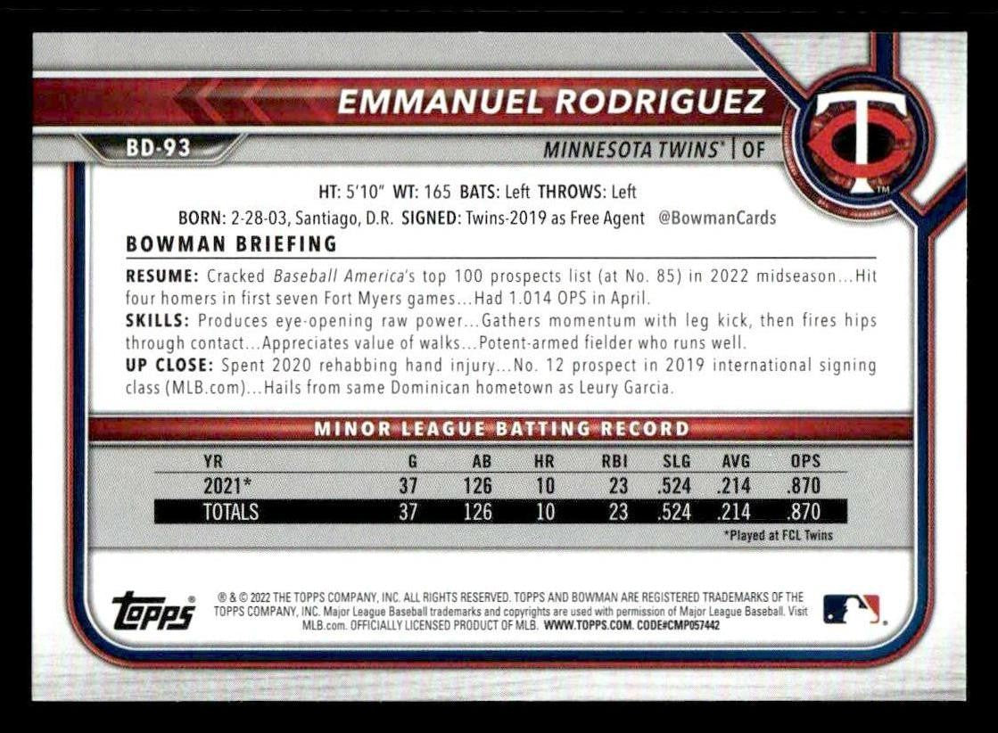 This is a nice example of a 2022 Bowman Draft 1st Edition #BD-93 Emmanuel Rodriguez