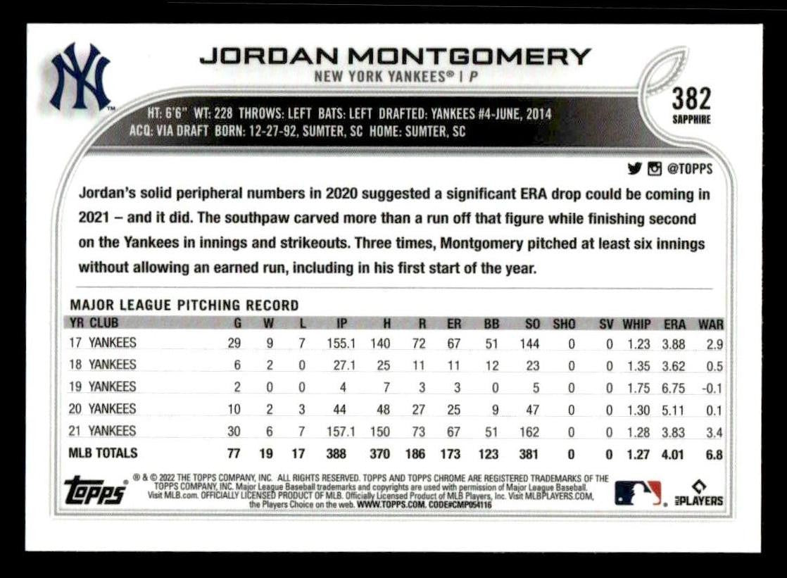 2022 Topps Chrome Sapphire Edition #382 Jordan Montgomery