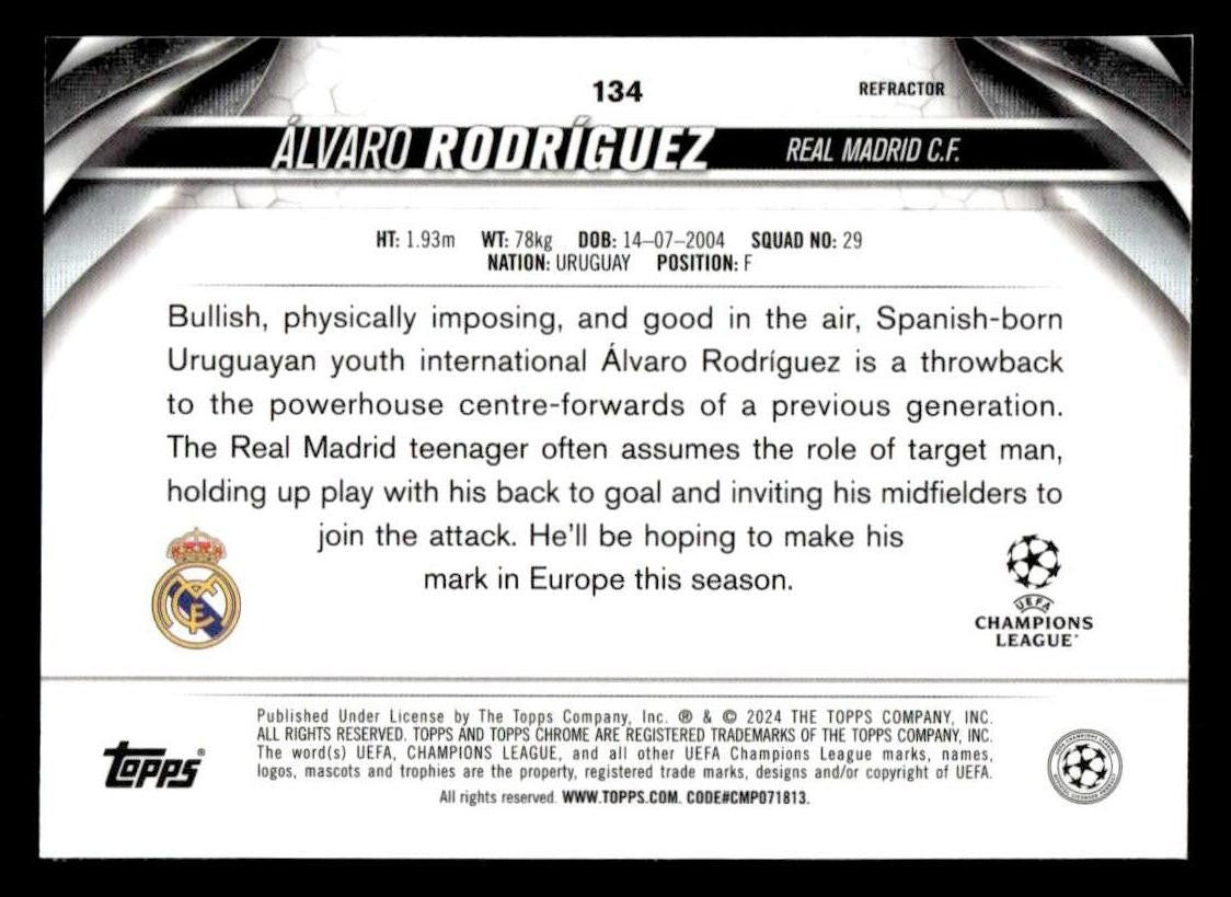 This is a nice example of a 2023-24 Topps Chrome UEFA Club Competitions #134 Álvaro Rodríguez Refractor