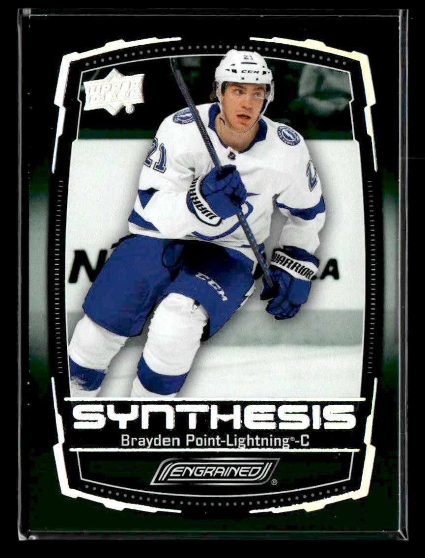 This is a nice example of a 2023-24 Upper Deck Engrained #S-12 Brayden Point Synthesis