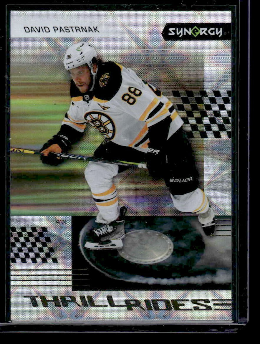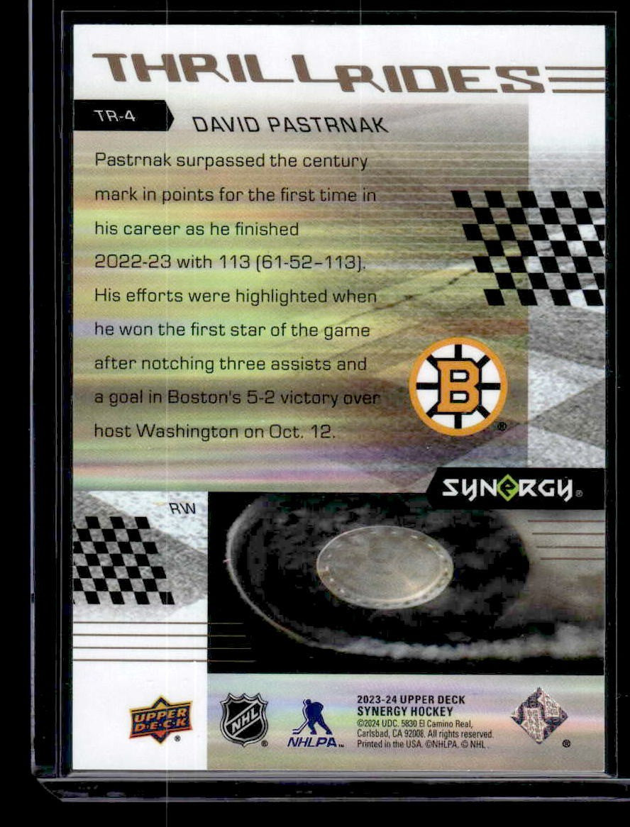 This is a nice example of a 2023-24 Upper Deck Synergy #TR-4 David Pastrnak Thrill Rides