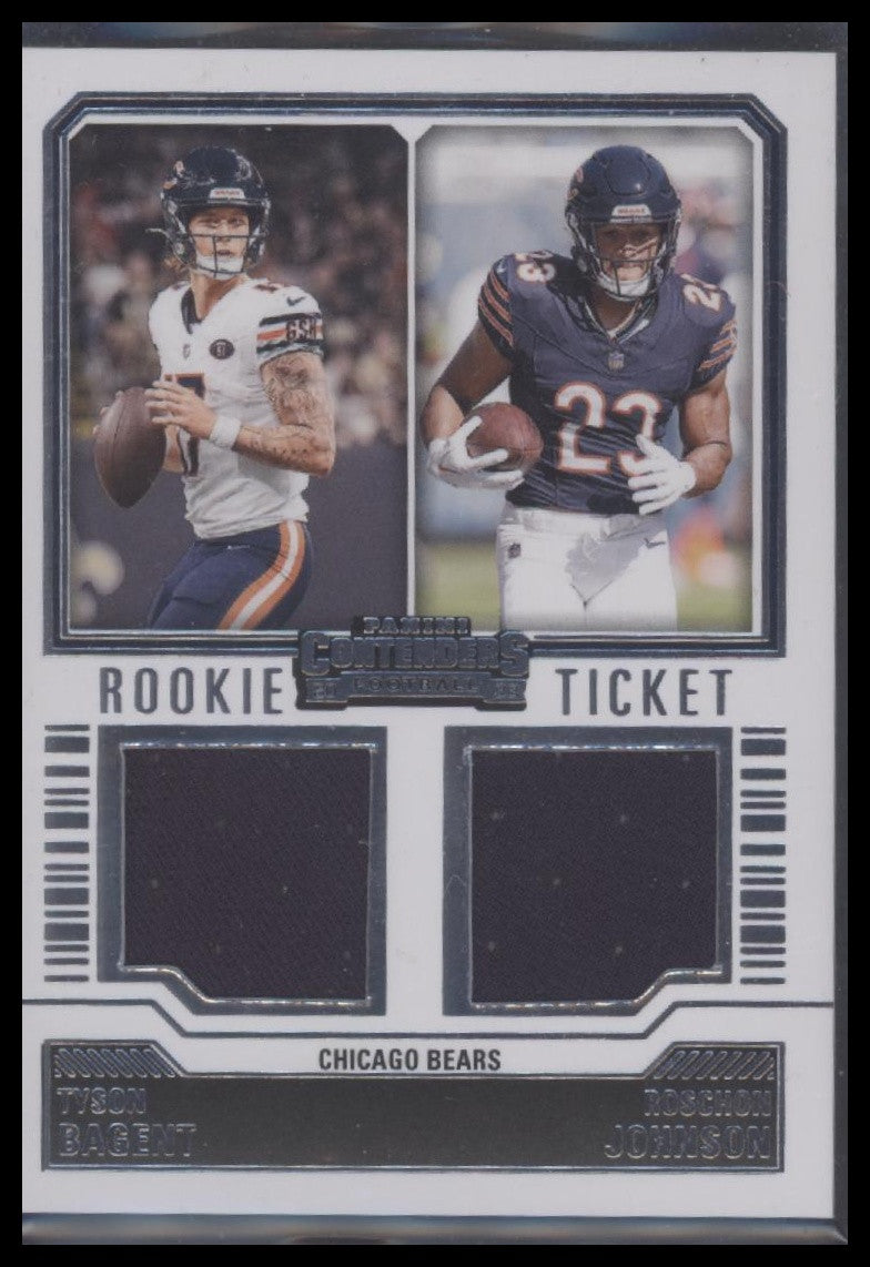 This is a nice example of a 2023 Panini Contenders #DS-15 Tyson Bagent / Roschon Johnson Rookie Ticket Dual Swatches