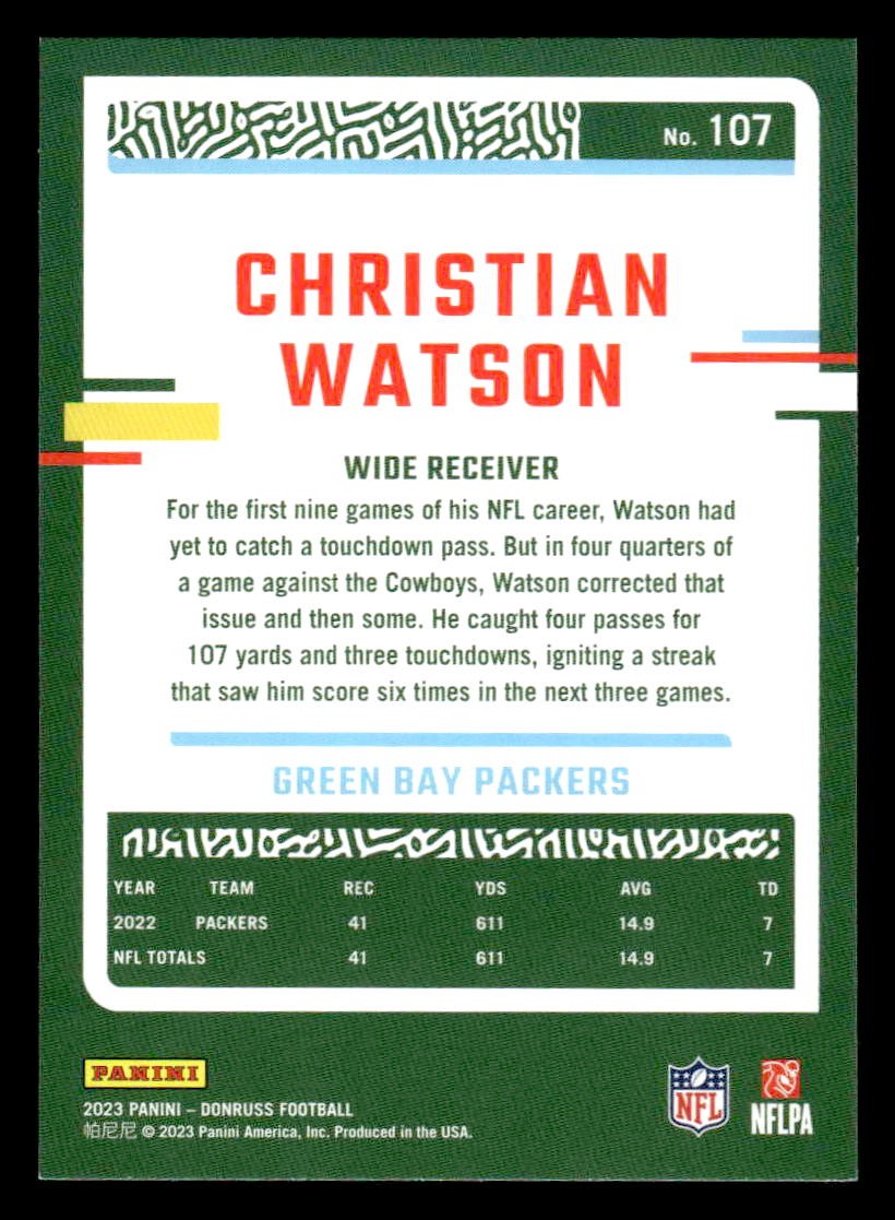 This is a nice example of a 2023 Donruss #107 Christian Watson