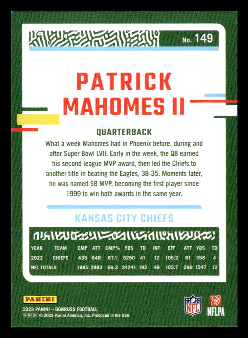 This is a nice example of a 2023 Donruss #149 Patrick Mahomes II