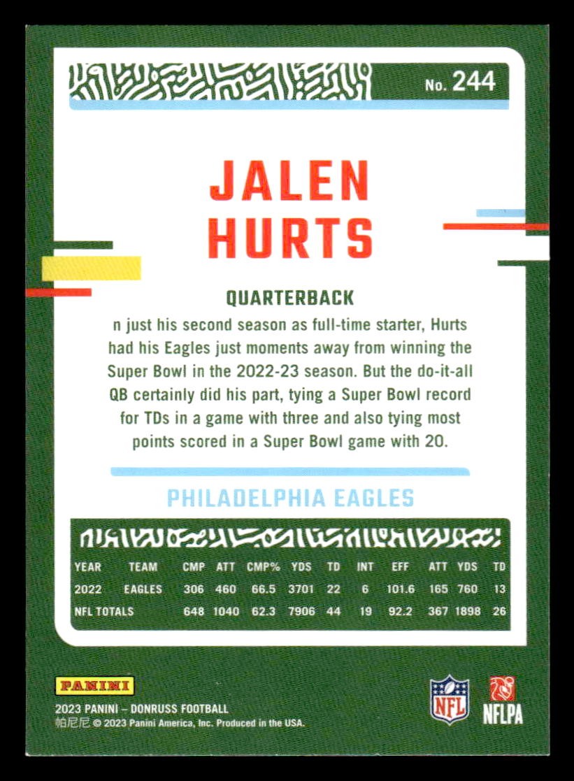 This is a nice example of a 2023 Donruss #244 Jalen Hurts