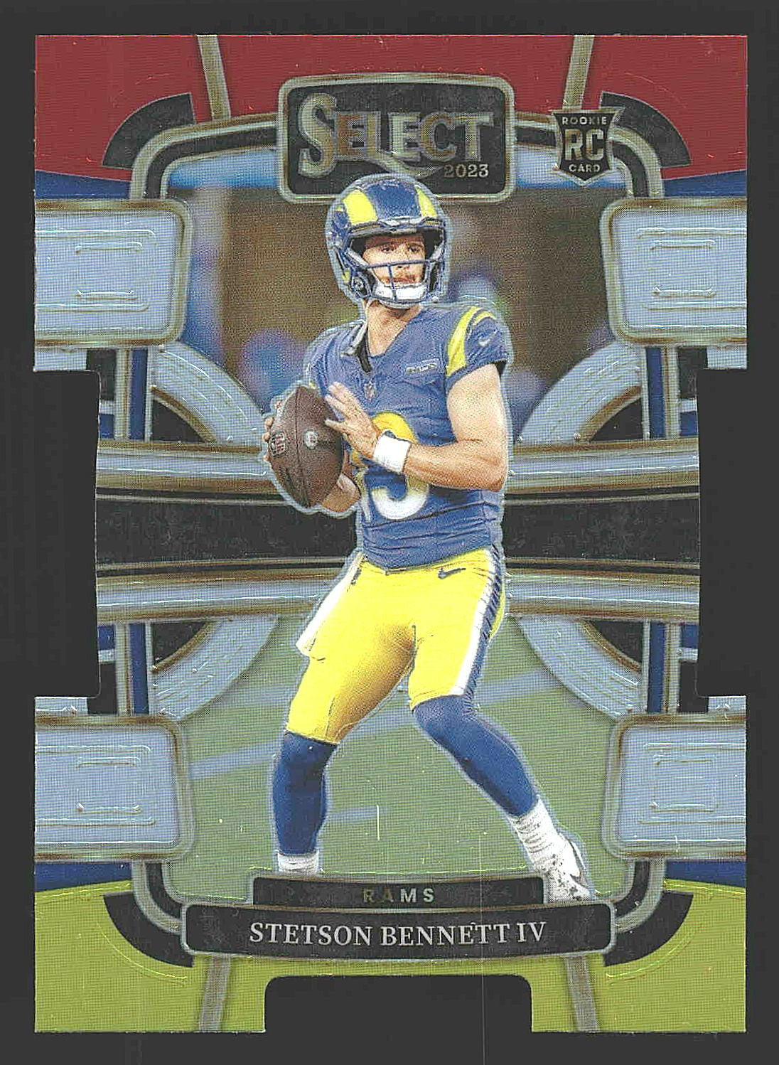 This is a nice example of a 2023 Panini Select #55 Stetson Bennett IV Red and Yellow Prizms Die Cuts