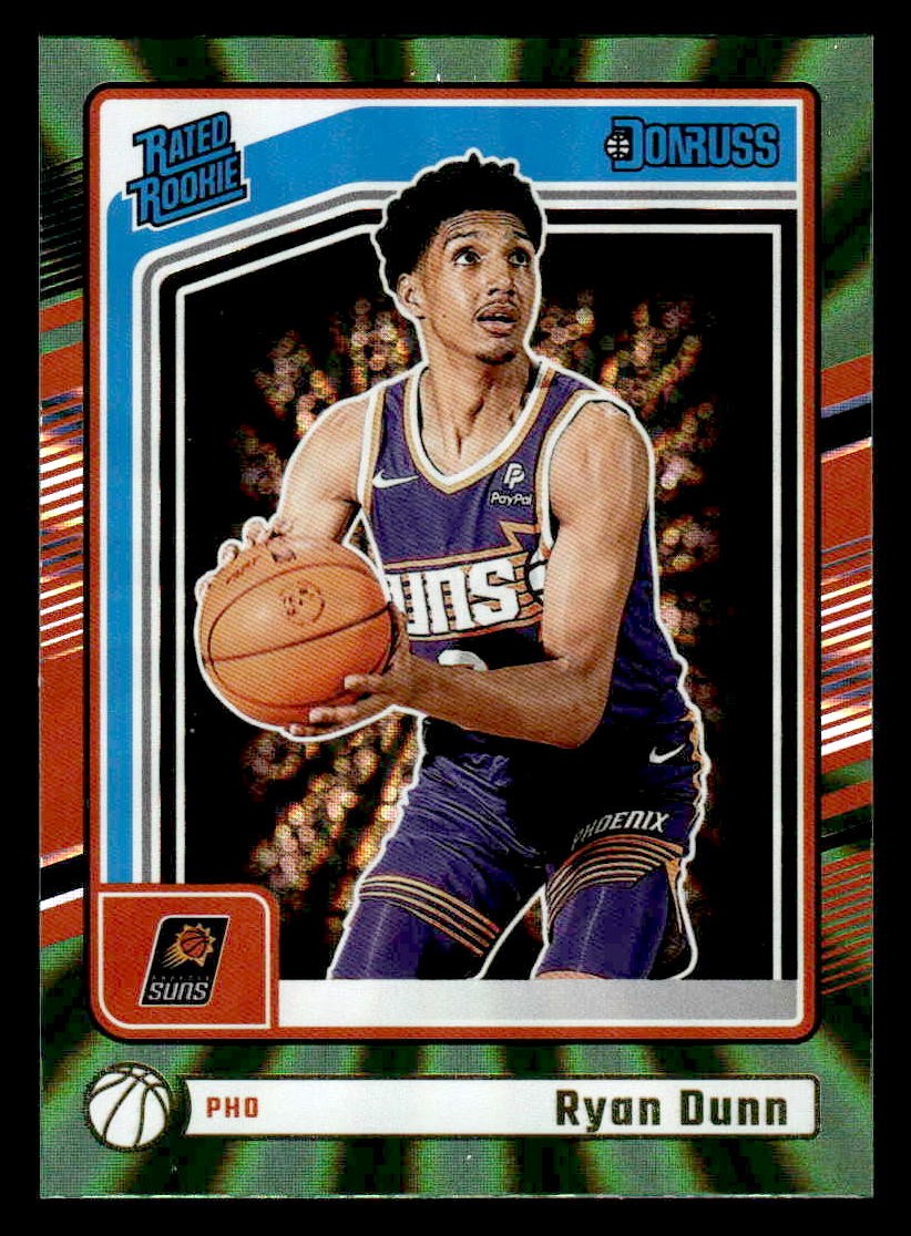 This is a nice example of a 2024-25 Donruss #214 Ryan Dunn Holo Green Laser