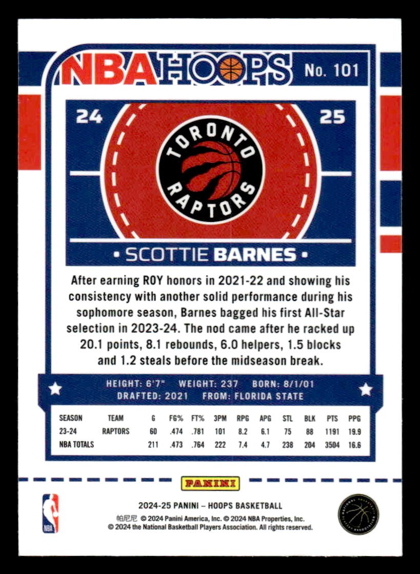 This is a nice example of a 2024-25 Hoops #101 Scottie Barnes Premium