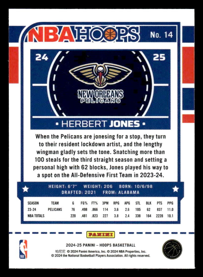 This is a nice example of a 2024-25 Hoops #14 Herbert Jones Premium