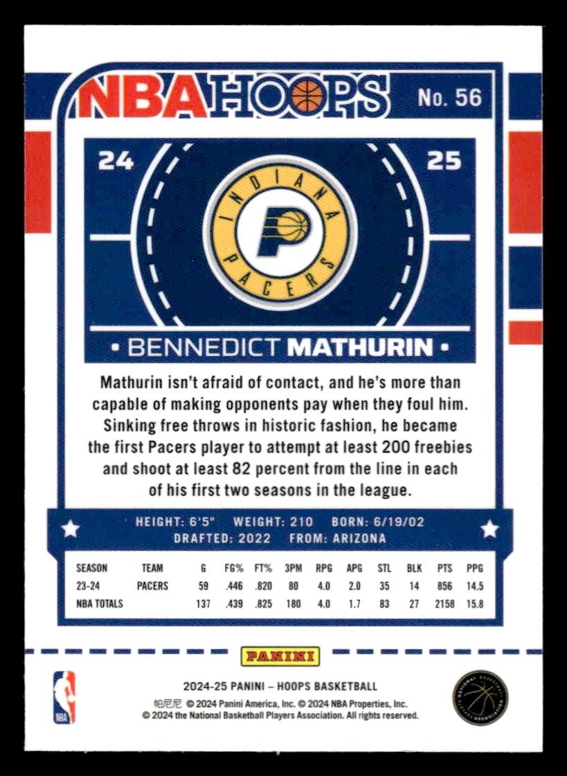 This is a nice example of a 2024-25 Hoops #56 Bennedict Mathurin Premium