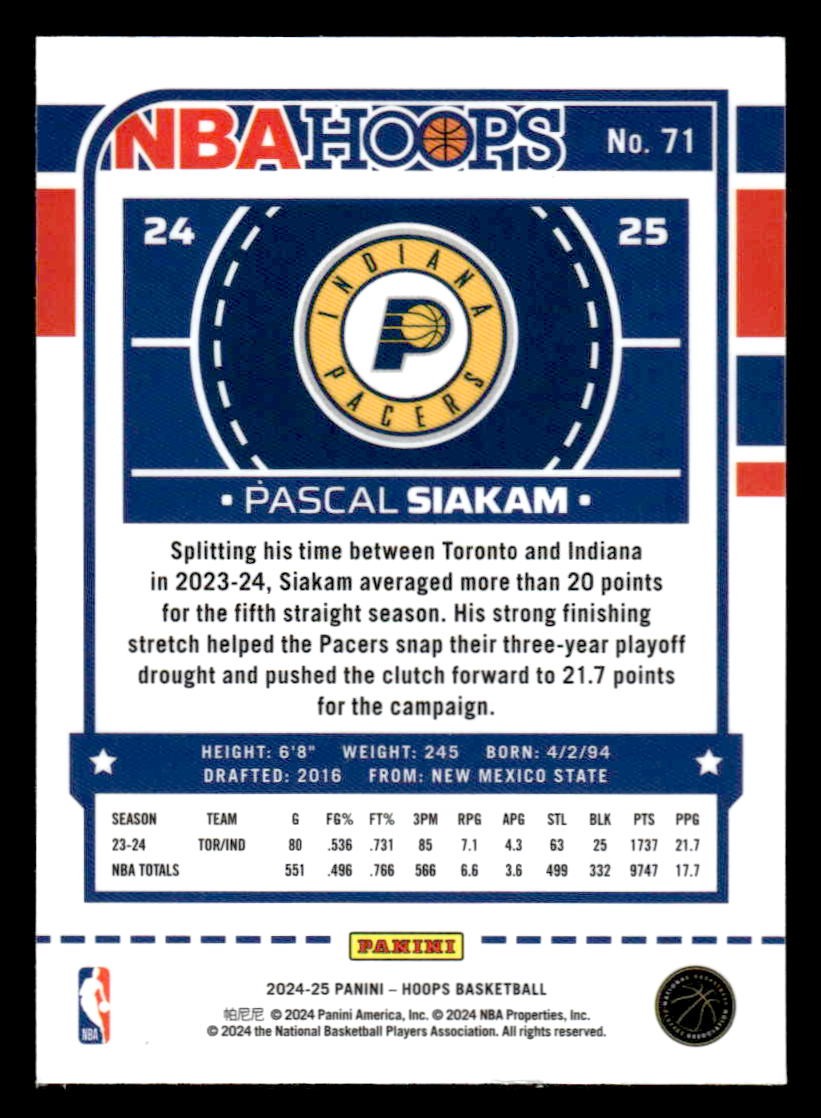 This is a nice example of a 2024-25 Hoops #71 Pascal Siakam Premium