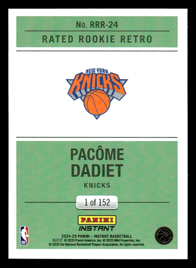 Pacôme Dadiet played for the New York Knicks in 2024, and this card is a standout from the Panini 2024-25 Panini Instant release. Whether you're chasing rookies, SSPs, or building a premium collection, this card delivers.