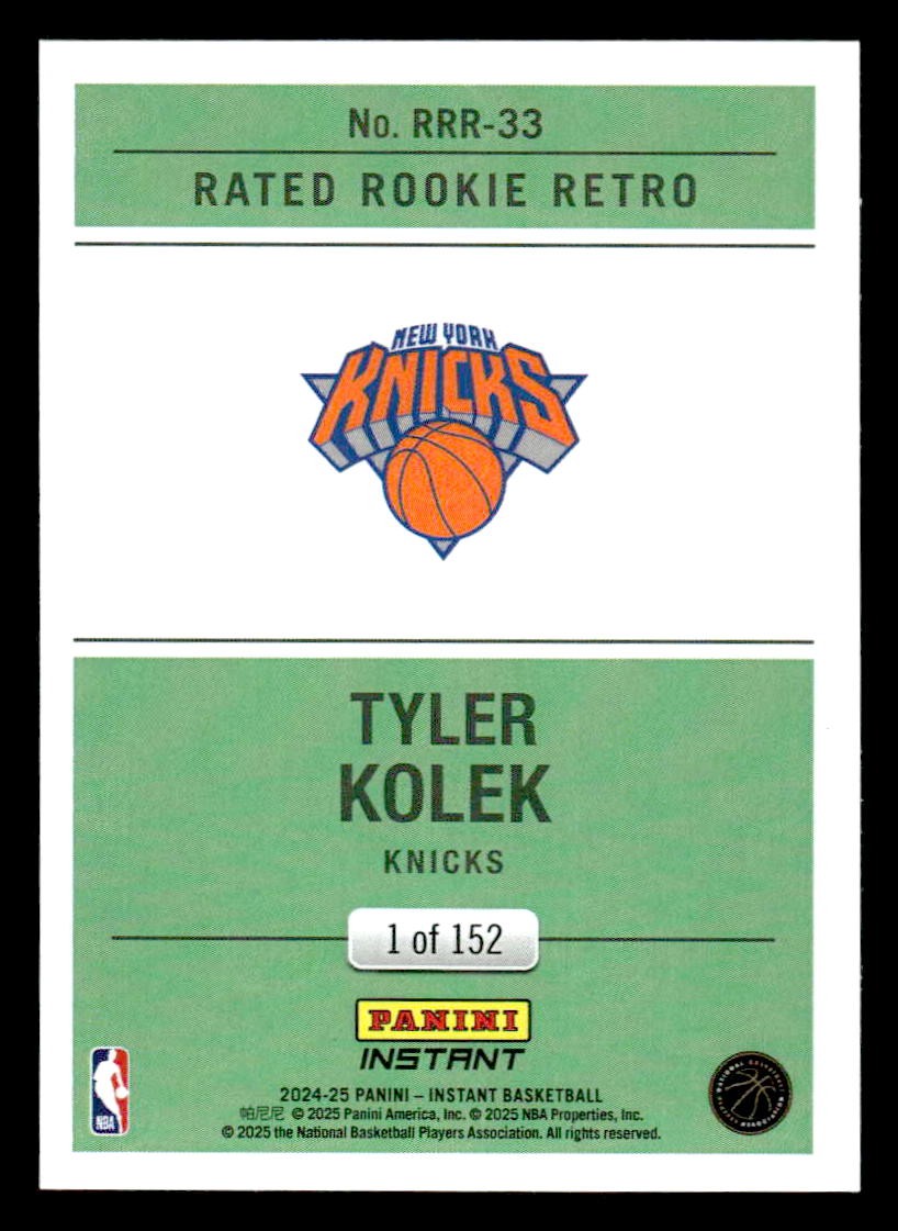 Tyler Kolek played for the New York Knicks in 2024, and this card is a standout from the Panini 2024-25 Panini Instant release. Whether you're chasing rookies, SSPs, or building a premium collection, this card delivers.