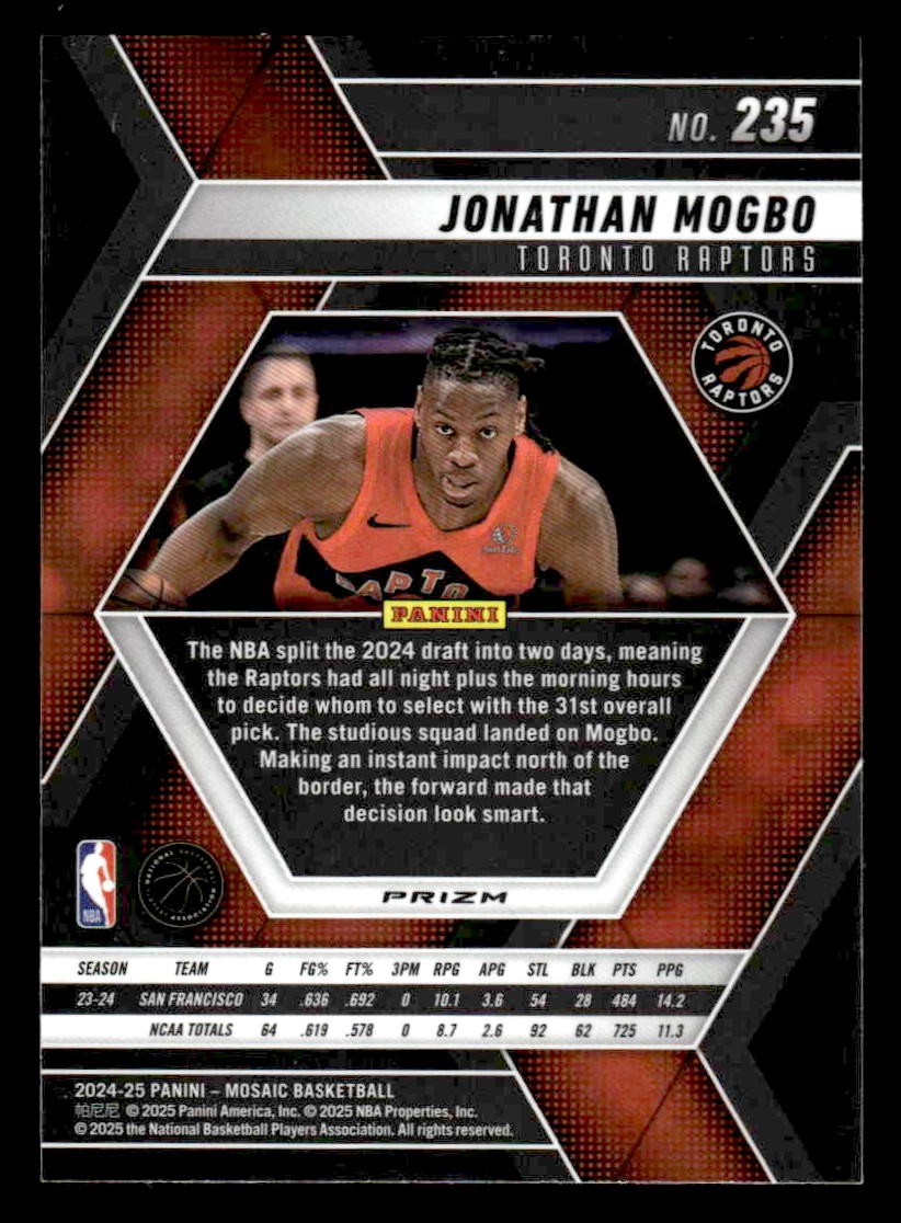 This is a sharp example of the 2024-25 Panini Mosaic #235 featuring Jonathan Mogbo.