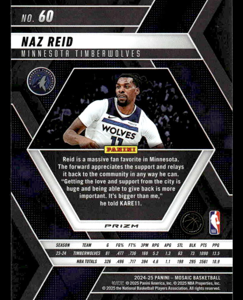 This is a sharp example of the 2024-25 Panini Mosaic #60 featuring Naz Reid.
