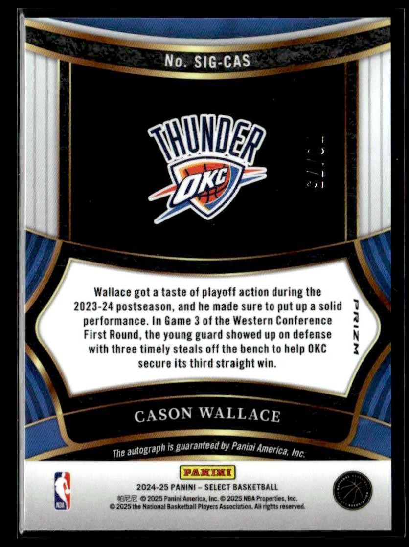Cason Wallace played for the Oklahoma City Thunder in 2024, and this card is a standout from the Panini 2024-25 Panini Select release. Whether you're chasing rookies, SSPs, or building a premium collection, this card delivers.