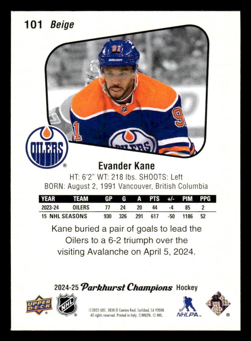 This is a sharp example of the 2024-25 Parkhurst Champions #101 featuring Evander Kane.